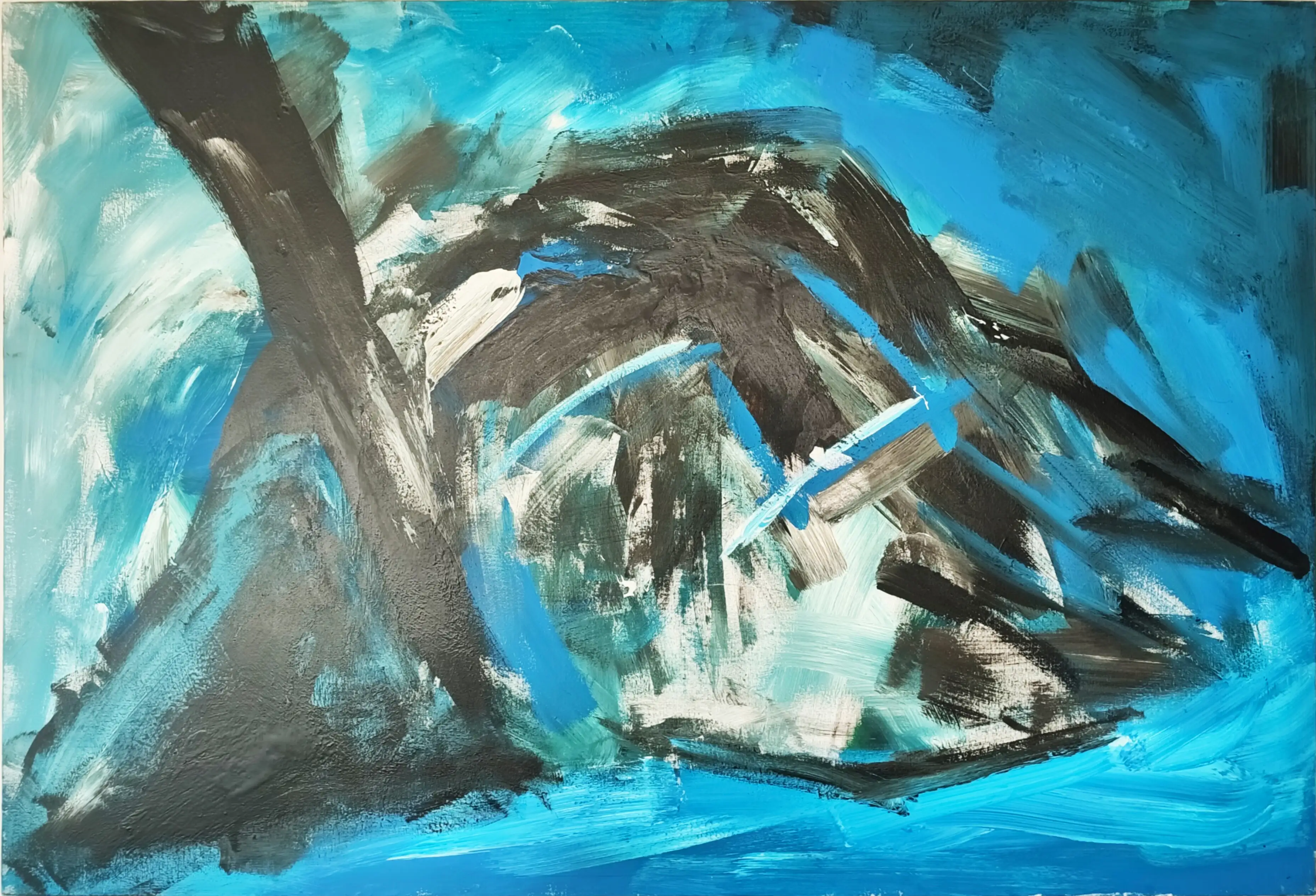 Sanatçının özgün paletinden yükselen “Dağ, Deniz, Gökyüzü” adlı eser, rastlantının ve deneyselliğin estetikle buluştuğu çarpıcı bir dışavurum örneğidir. Eserin oluşum sürecinde, fırça sürüşlerine tanınan sınırsız özgürlük, sanatçının iç dünyasındaki patlamayı tuvale aktarırken adeta bir katalizör görevi görmüştür. Akriliklerin canlılığı ile ziftin derin, katmanlı dokusunun alışılmadık birlikteliği, sanatçının kısa sürede tamamladığı bu esere benzersiz bir karakter kazandırmıştır. Malzemelerin beklenmedik uyumu, sanatçının içsel fırtınasını hem somut hem de soyut düzlemlerde gözler önüne serer. Tuval yüzeyinde dans eden kalınlı inceli fırça ritimleriyle şekillenen leke değerleri, bir içsel fırtınanın yansımalarını gösterir. Bu dışavurumcu topografya, izleyicide göğü ve denizi kıskıvrak saran, onları kendi kudretli varlığında sıkıştıran bir dağ imgesini uyandırır. Kompozisyon, alışılagelmiş peyzaj sınırlarını aşarak, doğanın ham ve ilkel gücünü, sanatçının sübjektif deneyimiyle yoğrulmuş bir şekilde aktarır. Eser, yalnızca görünenin ötesinde, hissedilen bir varoluşsal gerilimi ve uyumu bir arada barındırır.