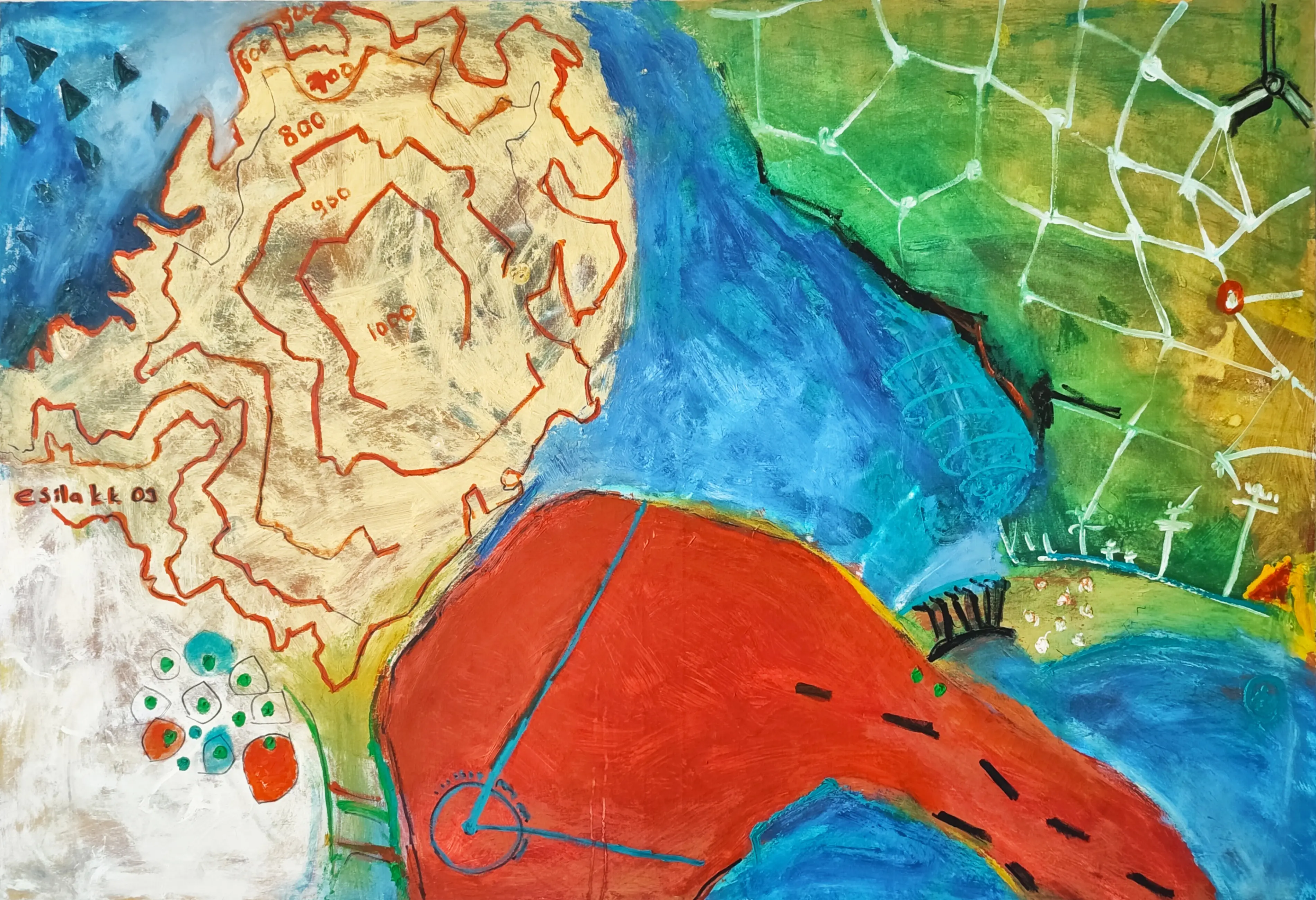 Uygulama Çalışmalarından “İzohips” adlı bu eser, sanatçının dış dünyayı algılayışındaki gizemi ve içsel gerçekliğin sonsuz olanaklarını harita imgeleriyle harmanlayarak ortaya koyduğu derinlikli bir yorumdur. Burada doğa, görünenin birebir aktarımı olmaktan ziyade, algıların süzgecinden geçmiş, düşsel ve dışavurumcu bir alana taşınır. Sanatçı, doğanın nesnelliğinden tamamen vazgeçmeden, onu mühendislik simgelerinin katı diliyle, bilinçdışının sınırsız verileri arasında diyalog kurmaya zorlar; böylece harita yalnızca bir yön bulma aracı olmaktan çıkıp, ruhsal bir topografyanın keşfine dönüşür. Eserin merkezinde, mühendislik disiplinine ait izohips (eş yükselti eğrileri) sistemiyle oluşturulmuş bir dağ figürü yer alır; ancak geleneksel haritacılık kuralları burada bilinçli bir meydan okumayla altüst edilir. Örneğin, deniz seviyesi alışıldık 0 metrenin aksine 500 metrede konumlandırılmış, dahası denizin içerisinde ormanlık alanları temsil eden üçgen simgelerle sıra dışı bir yerleşim oluşturulmuştur. Bu aykırılıklar, resme eklektik bir yapı kazandırarak, bilinçdışının sınır tanımayan gücünü vurgular. Harita dilindeki ormanlık alanı simgeleyen üçgenler ve nehir ya da denizi ifade eden mavi alanlar, sanatçının düşsel dünyasında yeniden kurgulanır, mühendislik ve sanatın kesişiminde yeni bir ifade biçimi yaratır. Resmin sol alt köşesindeki dairesel formlar, harita simgelerinden tam olarak ayrışmasa da, yerleşim alanlarını ve yapılarını imgesel bir dille aktarır. Köprü ve telefon direği gibi doğada rastladığımız nesnelerin varlığı, bu düşsel harita içerisinde bir yaşam alanının varlığını somutlaştırır. Tepeden görünümün sunduğu perspektifle birleşen mühendislik simgeleri ve renk kontrastları, dingin bir haritanın ötesinde, yaşayan, dinamik bir mekanı işaret eder. Eser boyunca kendini hissettiren bu ritimler, bazen bilinçli sembollerle, bazen de bilinçten bağımsız rastlantılarla yüzeye çıkar; ancak deniz imgesi, mavi renginin bütün gücünü koruyarak bu görsel senfoninin ayrılmaz bir parçası olmaya devam eder. Böylece “İzohips”, görünenin ardındaki gerçekliği, içsel bir haritalama süreciyle keşfe çıkan, çağdaş sanatın sınırlarını zorlayan eşsiz bir deneyim sunar.