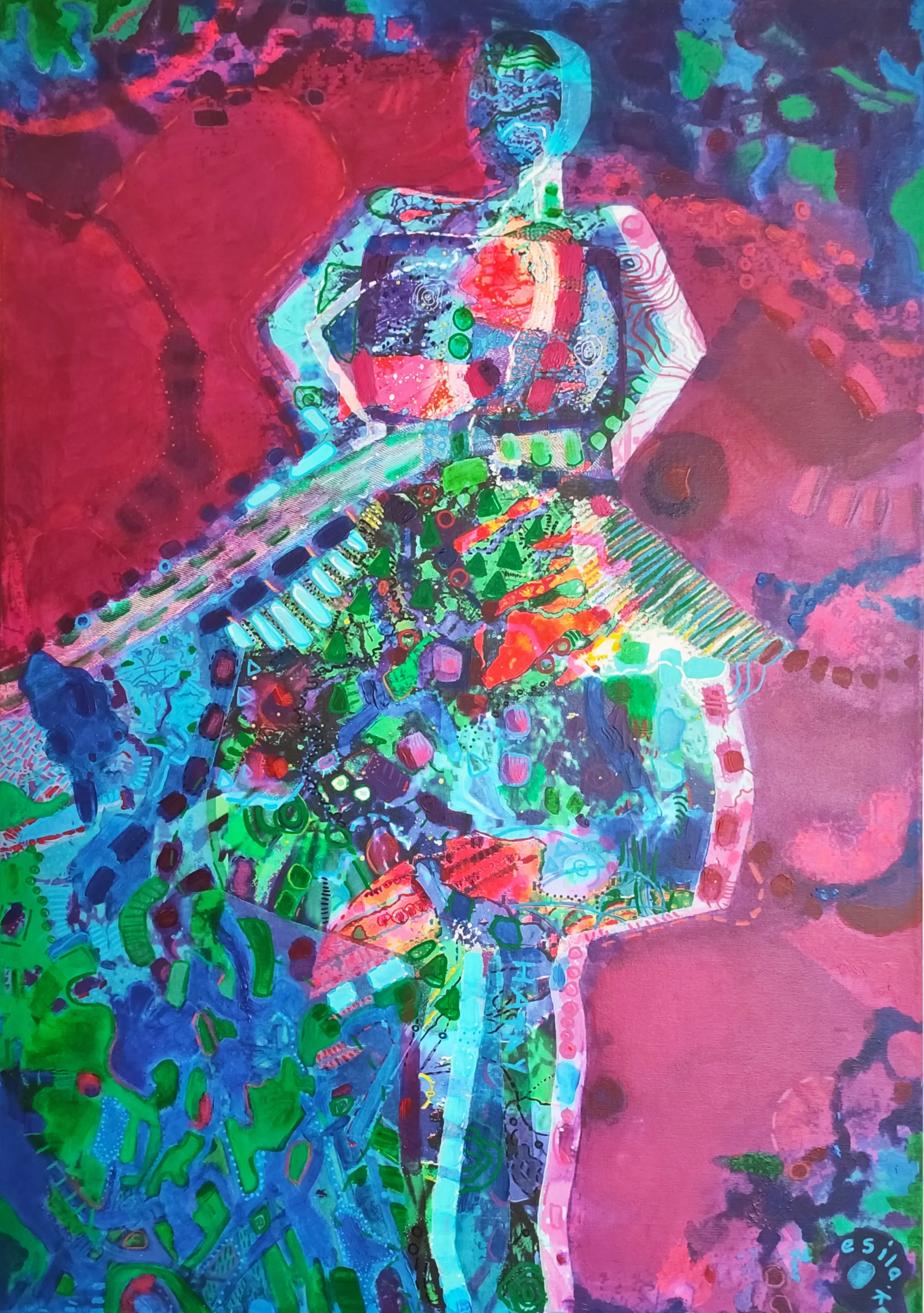 "Kadın ve Coğrafya" adlı eser, izleyiciyi insan ruhunun derinlikleri ile yeryüzünün kadim bilgeliği arasında kurulan büyüleyici bir diyaloğa davet ediyor. Sanatçının fırçasından çıkan her detay, dişil enerjinin sınırsız gücünü ve coğrafi biçimlerin katmanlı anlamlarını kusursuz bir uyumla birleştiriyor. Bu çalışma, figüratif unsurların soyut peyzajlarla iç içe geçtiği, adeta bir kucaklaşma anını yansıtan dinamik bir kompozisyon sunar.